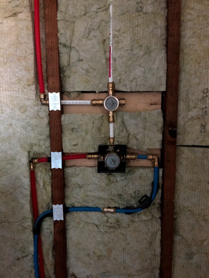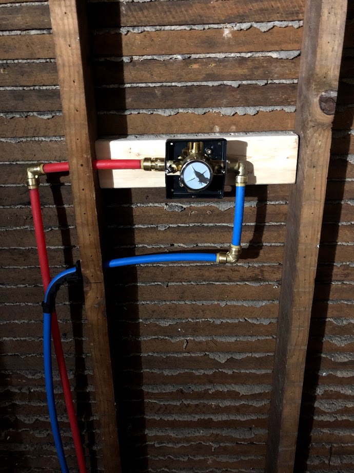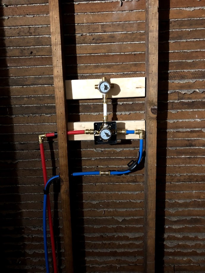 The shower plumbing looked like that for quite a while. I needed to wait until I had the actual fixtures purchased to make sure I was making the correct stub-outs. A few days ago, I finally finished plumbing all of the connections. And now she looks like this:
