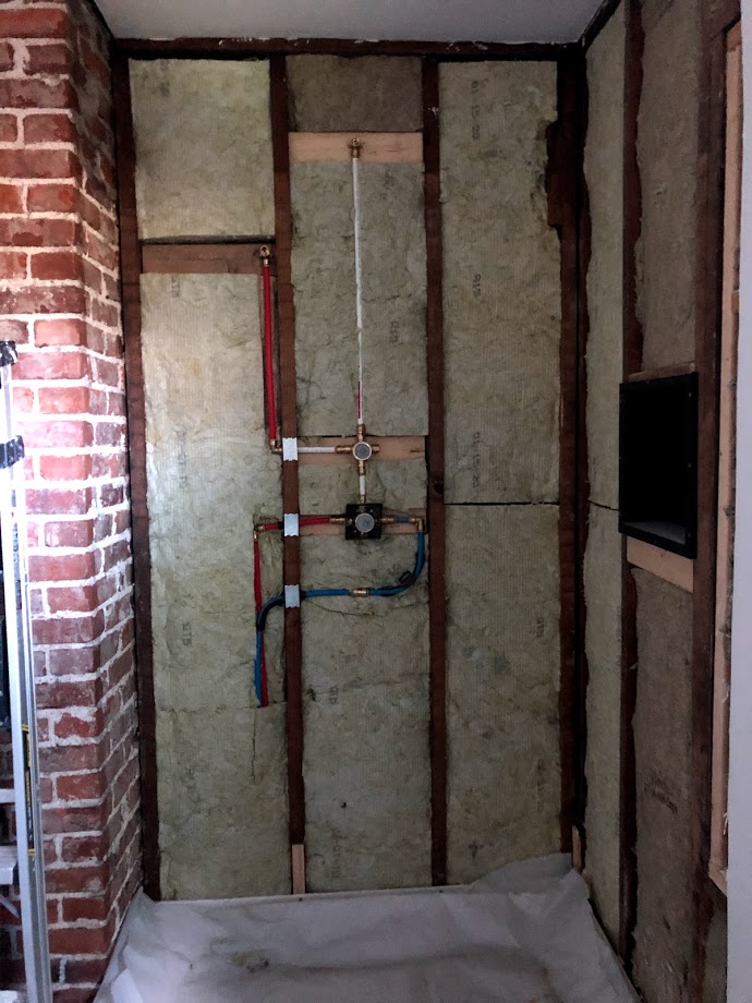 I added a threaded connection at two locations: 1. for the main shower head and another for the hand shower. The main shower head needed a female connection, but the hand shower required a male thread. We filled in with rock-wool insulation which will help dampen the sound of the shower through the shared wall with the living room. We are ready to add cement board and get ready to tile in here now! It feels strange that after looking at this exposed plumbing for almost a year, I will never see it again (fingers crossed).